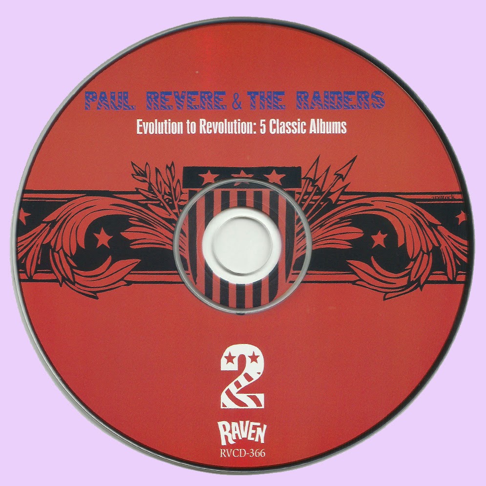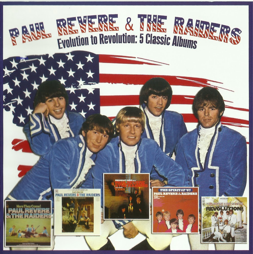 Though Paul Revere and the Raiders was a quintessentially American band, it’s the Australian label Raven Records that’s bringing the first Raiders-related release of 2013. The group’s first five Columbia Records albums, originally released between 1965 and 1967, are being compiled on two discs as Evolution to Revolution: 5 Classic Albums 1965-1967. Available on March 12, Evolution contains the entirety of Here They Come! (1965), Just like Us! (1965), Midnight Ride (1966), The Spirit of ‘67 (1966) and Revolution! (1967).
