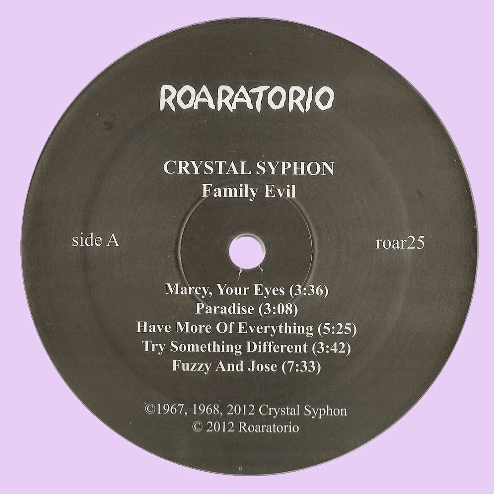 Crystal Syphon’s origins can be traced back to the Morlochs, a garage band who formed in 1965 and hailed from the San Joaquin Valley area. As the years went by (and after several personnel changes) the Morlochs changed their name to Crystal Syphon. Crystal Syphon played the S.F. live circuit with some of the era’s biggest names while the major labels expressed serious interest in this promising, up-and-coming group. As the 60’s passed into the 70’s, no album or single appeared and the group members moved on to other projects, effectively putting an end to Crystal Syphon. Roaratorio did a superb job in assembling this excellent LP (vinyl only release), which was cobbled together from studio sessions, demos and live shows. It’s arguably a fuller picture then any studio LP could give the listener, as all sides of the band are on full display, whether it be in the studio or on the live stage.